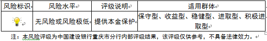 本期产品为保本浮动收益型理财产品,本理财产品有投资风险,只保障理财资金本金,不保证理财收益,您应当充分认识投资风险,谨慎投资。本期产品期限为180天(中国建设银行重庆市分行有权对产品进行展期或提前终止)。本期产品内部风险评级级别为一盏警示灯,风险程度属于无风险或风险极低,适用于保守型、收益型、稳健型、进取型及积极进取型投资者。最不利情况下,客户只能收回投资本金,不能获得任何投资收益。