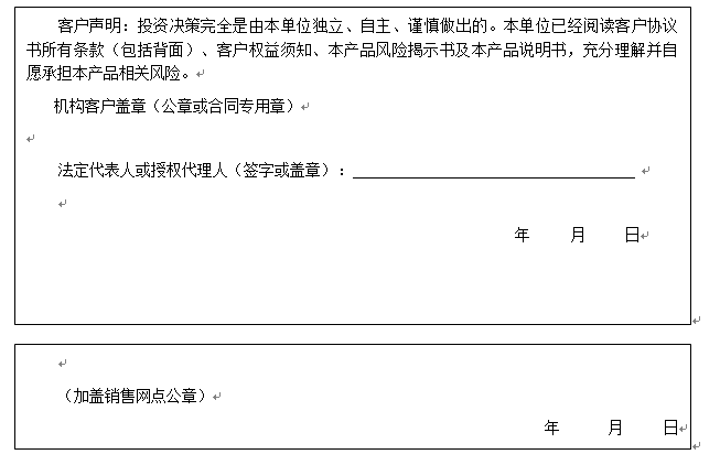 客户签名: ( 客户声明:投资决策完全是由客户独立、自主、谨慎做出的。客户已经阅读客户协议书所有条款(包括背面)、客户权益须知、本产品风险揭示书及本产品说明书,充分理解并自愿承担本产品相关风险。)