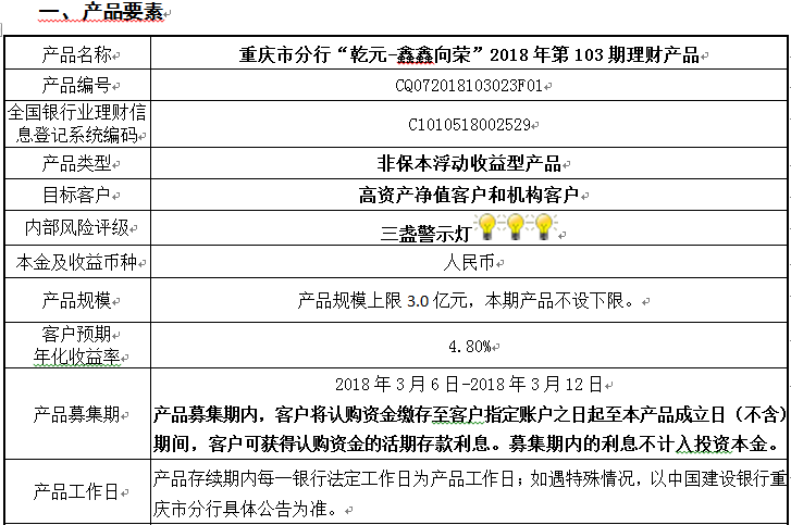中国建设银行重庆市分行“乾元-鑫鑫向荣” 2018年第103期理财产品风险揭示书和说明书