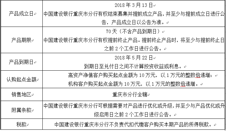 3.中国建设银行重庆市分行可根据市场情况等调整产品规模上、下限,并最迟于调整规模上下限当日进行公告。