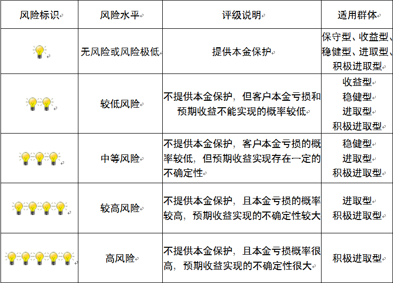 本产品为非保本浮动收益型理财产品,不保证本金和收益,请您充分认识投资风险,谨慎投资。本期产品期限为105天(中国建设银行有权对产品进行展期或提前终止),存续期内,产品不接受申购或赎回申请。本期产品内部风险评级级别为盏警示灯 ,风险水平属于较低风险。最不利情况下,您将损失全部收益甚至包括全部本金。本理财产品适用于收益型、稳健型、进取型 积极进取型客户。