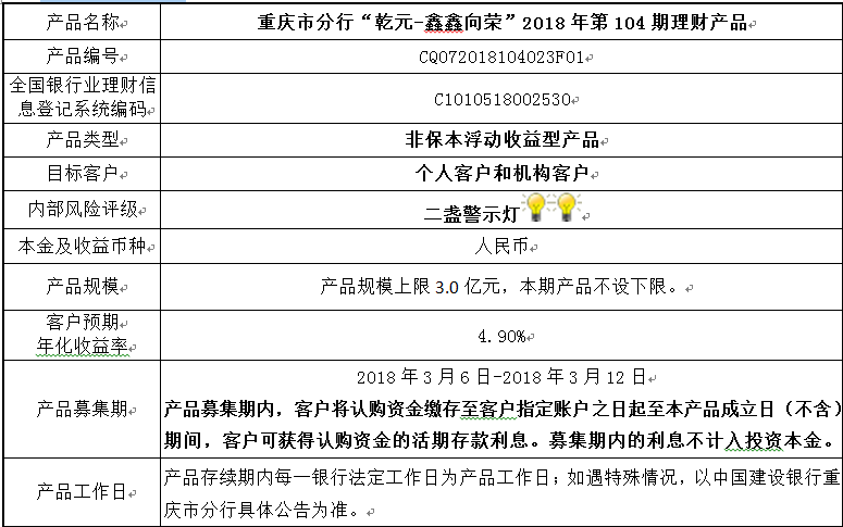 中国建设银行重庆市分行“乾元-鑫鑫向荣” 2018年第104期理财产品风险揭示书和说明书