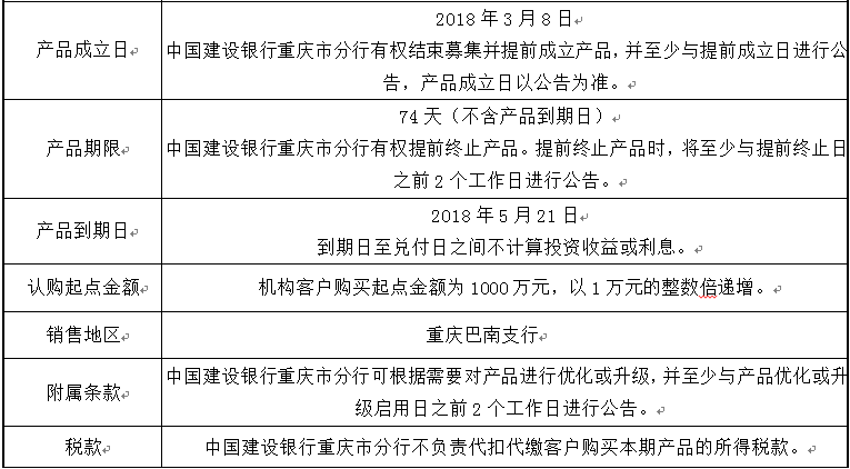 3.中国建设银行重庆市分行可根据市场情况等调整产品规模上、下限,并最迟于调整规模上下限当日进行公告。