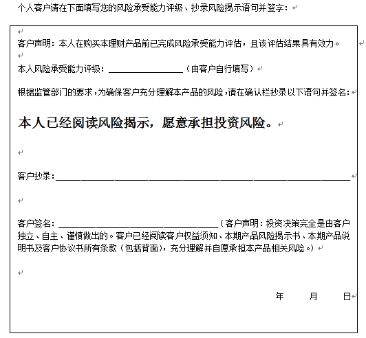 在您签署《中国建设银行股份有限公司理财产品客户协议书》前,应当仔细阅读客户权益须知、本风险揭示书及本产品的产品说明书的全部内容,同时向中国建设银行重庆市分行了解本产品的其他相关信息,并自己独立做出是否认(申)购本产品的决定。