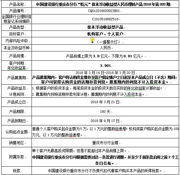 中国建设银行重庆市分行“乾元”保本浮动收益型 人民币理财产品2018年第020期风险揭示书和说明书