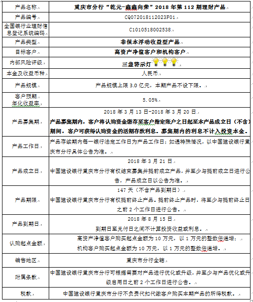 3.中国建设银行重庆市分行可根据市场情况等调整产品规模上、下限,并最迟于调整规模上下限当日进行公告。