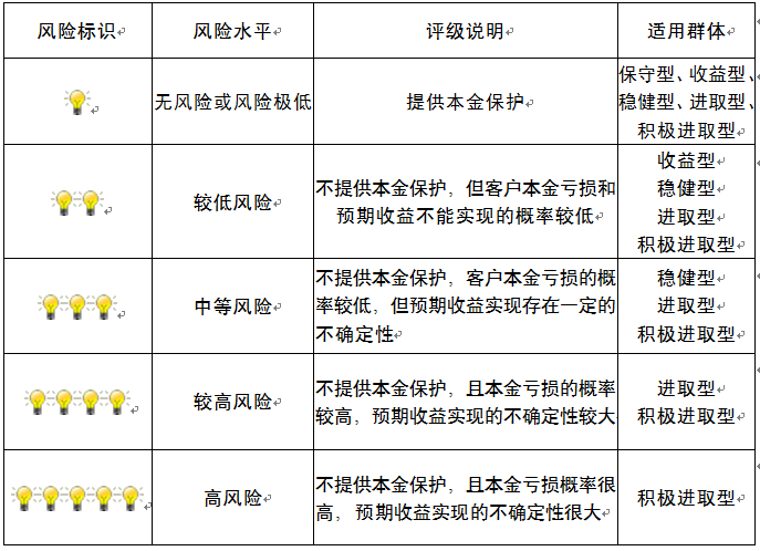 本产品为非保本浮动收益型理财产品,不保证本金和收益,请您充分认识投资风险,谨慎投资。本期产品期限为73天(中国建设银行有权对产品进行展期或提前终止),存续期内,产品不接受申购或赎回申请。本期产品内部风险评级级别为盏警示灯 ,风险水平属于较低风险。最不利情况下,您将损失全部收益甚至包括全部本金。本理财产品适用于收益型、稳健型、进取型 积极进取型客户。