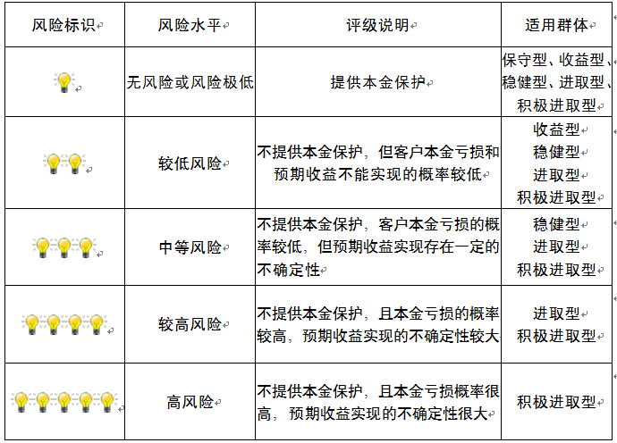 本产品为非保本浮动收益型理财产品,不保证本金和收益,请您充分认识投资风险,谨慎投资。本期产品期限为383天(中国建设银行有权对产品进行展期或提前终止),存续期内,产品不接受申购或赎回申请。本期产品内部风险评级级别为盏警示灯 ,风险水平属于较低风险。最不利情况下,您将损失全部收益甚至包括全部本金。本理财产品适用于收益型、稳健型、进取型 积极进取型客户。