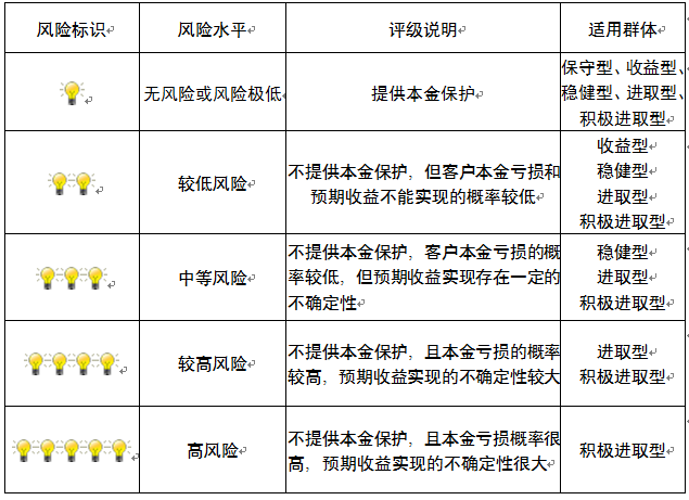 本产品为非保本浮动收益型理财产品,不保证本金和收益,请您充分认识投资风险,谨慎投资。本期产品期限为247天(中国建设银行有权对产品进行展期或提前终止),存续期内,产品不接受申购或赎回申请。本期产品内部风险评级级别为盏警示灯 ,风险水平属于较低风险。最不利情况下,您将损失全部收益甚至包括全部本金。本理财产品适用于收益型、稳健型、进取型 积极进取型客户。