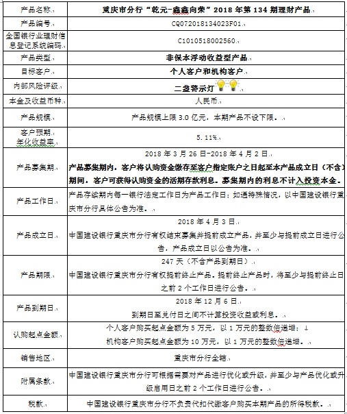 中国建设银行重庆市分行“乾元-鑫鑫向荣” 2018年第134期理财产品风险揭示书和说明书