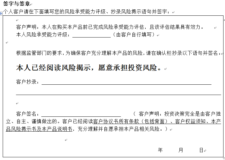 您签署本风险揭示书、客户协议书,并将资金委托给中国建设银行重庆市分行运作是您真实的意思表示。本风险揭示书及相应的客户协议书、产品说明书、客户权益须知将共同构成贵我双方理财合同的有效组成部分。