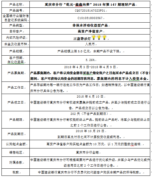 中国建设银行重庆市分行“乾元-鑫鑫向荣” 2018年第147期理财产品风险揭示书和说明书