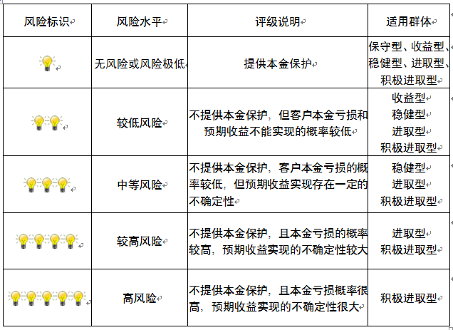 本产品为非保本浮动收益型理财产品,不保证本金和收益,请您充分认识投资风险,谨慎投资。本期产品期限为72天(中国建设银行有权对产品进行展期或提前终止),存续期内,产品不接受申购或赎回申请。本期产品内部风险评级级别为盏警示灯 ,风险水平属于较低风险。最不利情况下,您将损失全部收益甚至包括全部本金。本理财产品适用于收益型、稳健型、进取型 积极进取型客户。