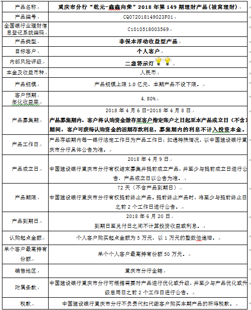 中国建设银行重庆市分行“乾元-鑫鑫向荣” 2018年第149期理财产品风险揭示书和说明书