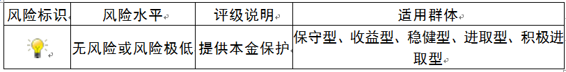 ,风险程度属于无风险或风险极低,适用于保守型、收益型、稳健型、进取型及积极进取型投资者。最不利情况下,客户只能收回投资本金,不能获得任何投资收益。