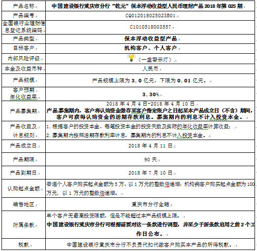 1.本产品规模上限:3.0亿元。在本期产品募集期内,对本期产品的认购金额达到本期理财产品规模上限,则中国建设银行重庆市分行有权利但无义务停止本期产品的认购,已经认购成功的客户投资权益不受影响。