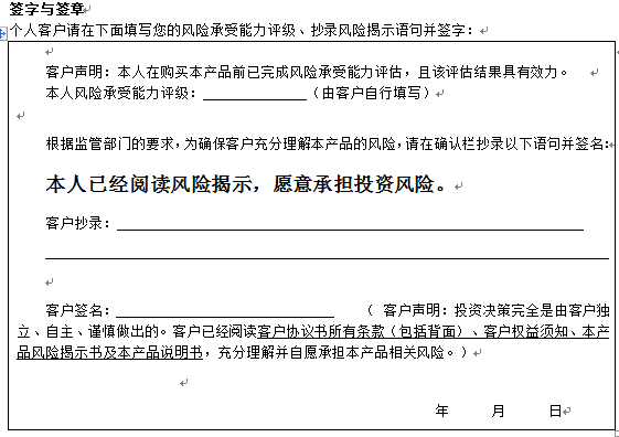 您签署本风险揭示书、客户协议书,并将资金委托给中国建设银行重庆市分行运作是您真实的意思表示。本风险揭示书及相应的客户协议书、产品说明书、客户权益须知将共同构成贵我双方理财合同的有效组成部分。