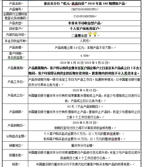 1. 本产品不保障本金及收益安全,中国建设银行重庆市分行发行本产品不代表对本产品的任何保本或收益承诺。
