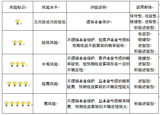 本产品为非保本浮动收益型理财产品,不保证本金和收益,请您充分认识投资风险,谨慎投资。本期产品期限为378天(中国建设银行有权对产品进行展期或提前终止),存续期内,产品不接受申购或赎回申请。本期产品内部风险评级级别为盏警示灯 ,风险水平属于较低风险。最不利情况下,您将损失全部收益甚至包括全部本金。本理财产品适用于收益型、稳健型、进取型 积极进取型客户。