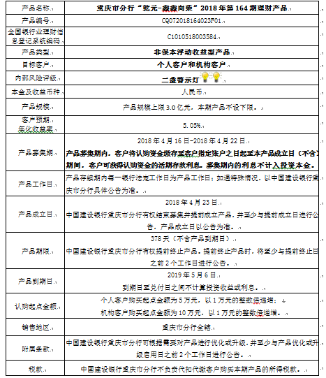 中国建设银行重庆市分行“乾元-鑫鑫向荣” 2018年第164期理财产品风险揭示书和说明书