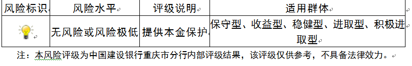 本期产品为保本浮动收益型理财产品,本理财产品有投资风险,只保障理财资金本金,不保证理财收益,您应当充分认识投资风险,谨慎投资。本期产品期限为180天(中国建设银行重庆市分行有权对产品进行展期或提前终止)。本期产品内部风险评级级别为一盏警示灯,风险程度属于无风险或风险极低,适用于保守型、收益型、稳健型、进取型及积极进取型投资者。最不利情况下,客户只能收回投资本金,不能获得任何投资收益。