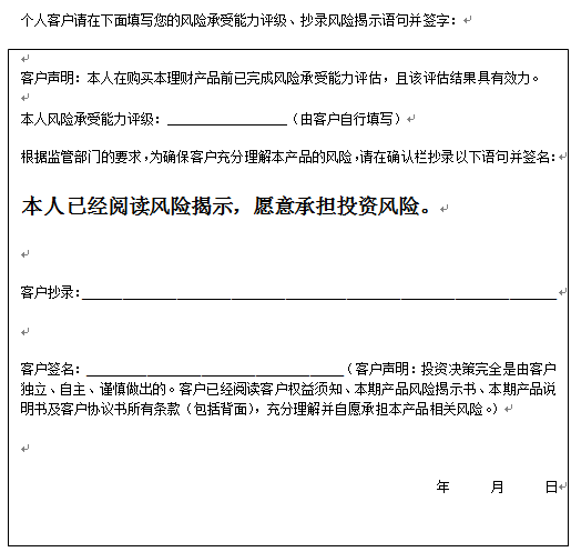 在您签署《中国建设银行股份有限公司理财产品客户协议书》前,应当仔细阅读客户权益须知、本风险揭示书及本产品的产品说明书的全部内容,同时向中国建设银行重庆市分行了解本产品的其他相关信息,并自己独立做出是否认(申)购本产品的决定。