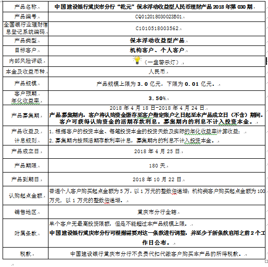 中国建设银行重庆市分行“乾元”保本浮动收益型 人民币理财产品2018年第030期风险揭示书和说明书