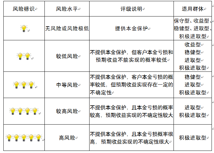 本产品为非保本浮动收益型理财产品,不保证本金和收益,请您充分认识投资风险,谨慎投资。本期产品期限为102天(中国建设银行有权对产品进行展期或提前终止),存续期内,产品不接受申购或赎回申请。本期产品内部风险评级级别为盏警示灯 ,风险水平属于中等风险。最不利情况下,您将损失全部收益甚至包括全部本金。本理财产品适用于稳健型、进取型 积极进取型客户。