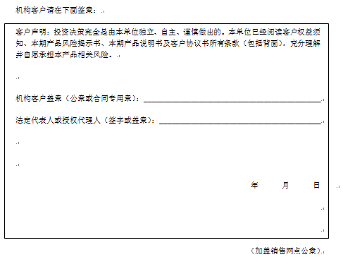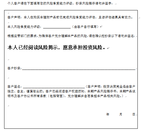 在您签署《中国建设银行股份有限公司理财产品客户协议书》前,应当仔细阅读客户权益须知、本风险揭示书及本产品的产品说明书的全部内容,同时向中国建设银行重庆市分行了解本产品的其他相关信息,并自己独立做出是否认(申)购本产品的决定。