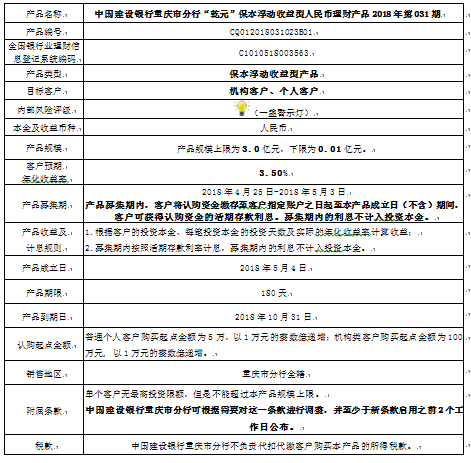 中国建设银行重庆市分行“乾元”保本浮动收益型 人民币理财产品2018年第031期风险揭示书和说明书