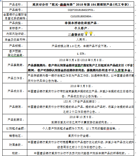 中国建设银行重庆市分行“乾元-鑫鑫向荣” 2018年第184期理财产品风险揭示书和说明书