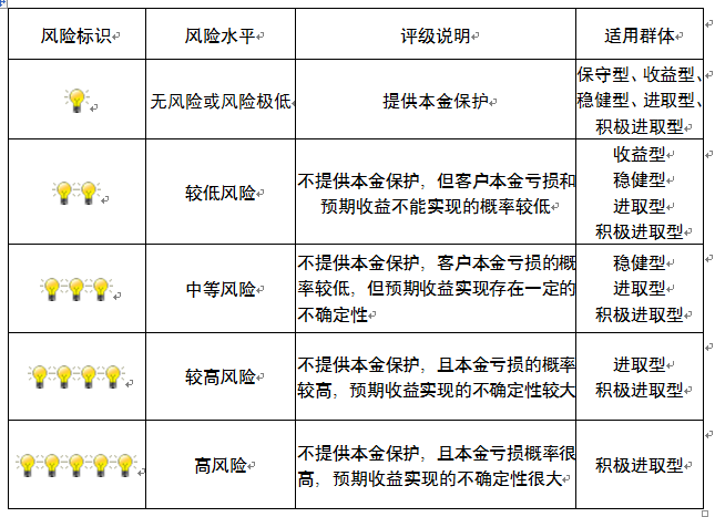 本产品为非保本浮动收益型理财产品,不保证本金和收益,请您充分认识投资风险,谨慎投资。本期产品期限为363天(中国建设银行有权对产品进行展期或提前终止),存续期内,产品不接受申购或赎回申请。本期产品内部风险评级级别为盏警示灯 ,风险水平属于较低风险。最不利情况下,您将损失全部收益甚至包括全部本金。本理财产品适用于收益型、稳健型、进取型 积极进取型客户。