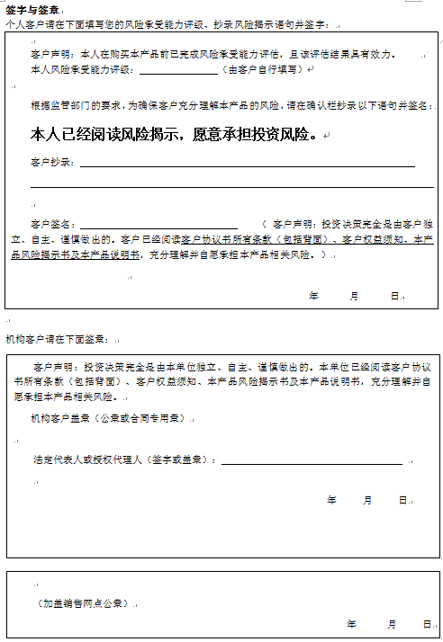 您签署本风险揭示书、客户协议书,并将资金委托给中国建设银行重庆市分行运作是您真实的意思表示。本风险揭示书及相应的客户协议书、产品说明书、客户权益须知将共同构成贵我双方理财合同的有效组成部分。