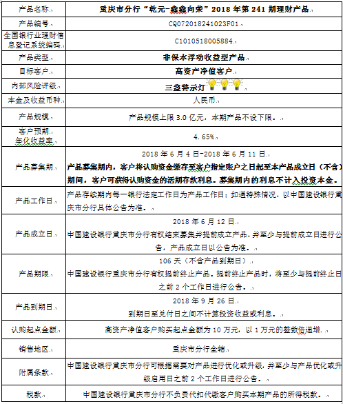中国建设银行重庆市分行“乾元-鑫鑫向荣” 2018年第241期理财产品风险揭示书和产品说明书