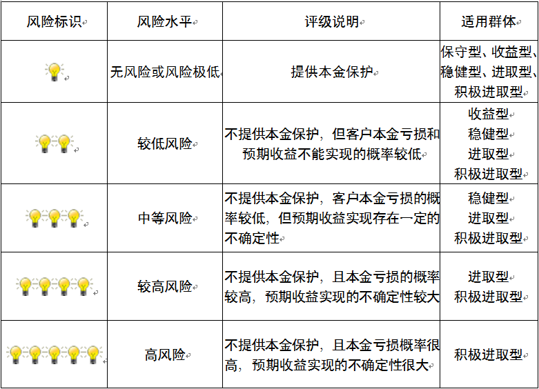 本产品为非保本浮动收益型理财产品,不保证本金和收益,请您充分认识投资风险,谨慎投资。本期产品期限为94天(中国建设银行有权对产品进行展期或提前终止),存续期内,产品不接受申购或赎回申请。本期产品内部风险评级级别为二盏警示灯,风险水平属于较低风险。最不利情况下,您将损失全部收益甚至包括全部本金。本理财产品适用于收益型、稳健型、进取型 、积极进取型客户。