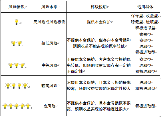 本产品为非保本浮动收益型理财产品,不保证本金和收益,请您充分认识投资风险,谨慎投资。本期产品期限为154天(中国建设银行有权对产品进行展期或提前终止),存续期内,产品不接受申购或赎回申请。本期产品内部风险评级级别为盏警示灯,风险水平属于较低风险。最不利情况下,您将损失全部收益甚至包括全部本金。本理财产品适用于收益型、稳健型、进取型 积极进取型客户。
