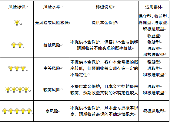 本产品为非保本浮动收益型理财产品,不保证本金和收益,请您充分认识投资风险,谨慎投资。本期产品期限为122天(中国建设银行有权对产品进行展期或提前终止),存续期内,产品不接受申购或赎回申请。本期产品内部风险评级级别为二盏警示灯,风险水平属于较低风险。最不利情况下,您将损失全部收益甚至包括全部本金。本理财产品适用于收益型、稳健型、进取型 、积极进取型客户。