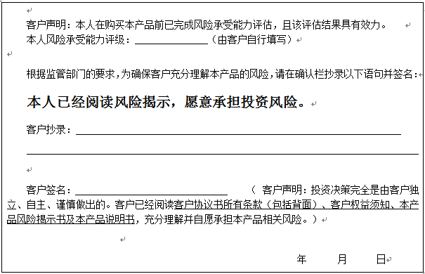 个人客户请在下面填写您的风险承受能力评级、抄录风险揭示语句并签字: