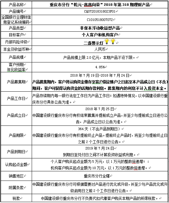 3.中国建设银行重庆市分行可根据市场情况等调整产品规模上、下限,并最迟于调整规模上下限当日进行公告。