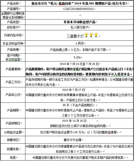 中国建设银行重庆市分行“乾元-鑫鑫向荣” 2018年第665期理财产品风险揭示书和产品说明书