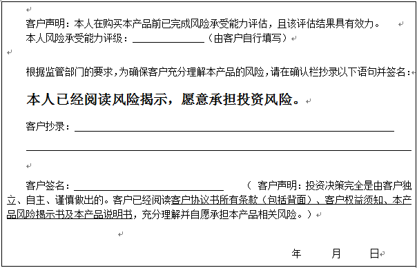 个人客户请在下面填写您的风险承受能力评级、抄录风险揭示语句并签字: