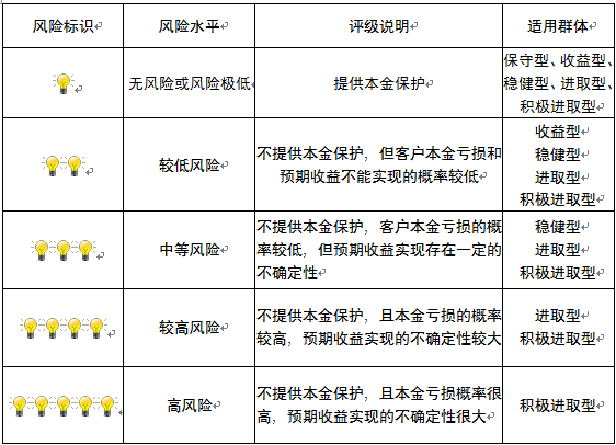 本产品为非保本浮动收益型理财产品,不保证本金和收益,请您充分认识投资风险,谨慎投资。本期产品期限为138天(中国建设银行有权对产品进行展期或提前终止),存续期内,产品不接受申购或赎回申请。本期产品内部风险评级级别为二盏警示灯,风险水平属于较低风险。最不利情况下,您将损失全部收益甚至包括全部本金。本理财产品适用于收益型、稳健型、进取型 、积极进取型客户。