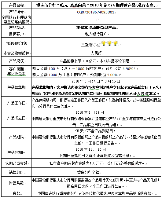 3.中国建设银行重庆市分行可根据市场情况等调整产品规模上、下限,并最迟于调整规模上下限当日进行公告。
