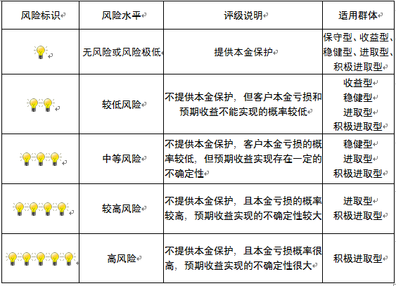 本产品为非保本浮动收益型理财产品,不保证本金和收益,请您充分认识投资风险,谨慎投资。本期产品期限为104天(中国建设银行有权对产品进行展期或提前终止),存续期内,产品不接受申购或赎回申请。本期产品内部风险评级级别为盏警示灯 ,风险水平属于中等风险。最不利情况下,您将损失全部收益甚至包括全部本金。本理财产品适用于稳健型、进取型 积极进取型客户。