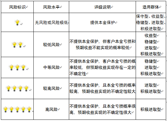 本产品为非保本浮动收益型理财产品,不保证本金和收益,请您充分认识投资风险,谨慎投资。本期产品期限为153天(中国建设银行有权对产品进行展期或提前终止),存续期内,产品不接受申购或赎回申请。本期产品内部风险评级级别为盏警示灯 ,风险水平属于较低风险。最不利情况下,您将损失全部收益甚至包括全部本金。本理财产品适用于收益型、稳健型、进取型 积极进取型客户。