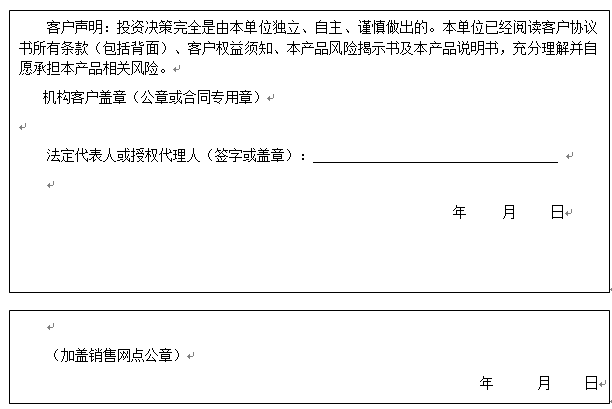 客户签名:                                    客户声明:投资决策完全是由客户独立、自主、谨慎做出的。客户已经阅读客户协议书所有条款(包括背面)、客户权益须知、本产品风险揭示书及本产品说明书,充分理解并自愿承担本产品相关风险。)