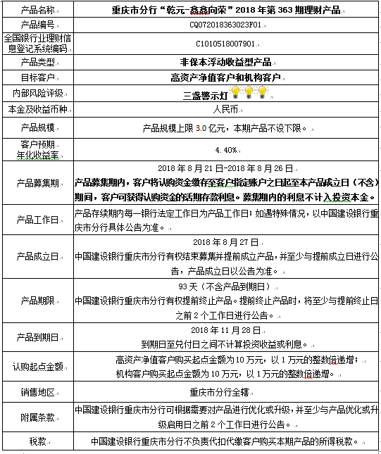 中国建设银行重庆市分行“乾元-鑫鑫向荣” 2018年第363期理财产品风险揭示书和产品说明书