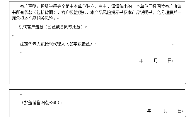客户签名: ( 客户声明:投资决策完全是由客户独立、自主、谨慎做出的。客户已经阅读客户协议书所有条款(包括背面)、客户权益须知、本产品风险揭示书及本产品说明书,充分理解并自愿承担本产品相关风险。)