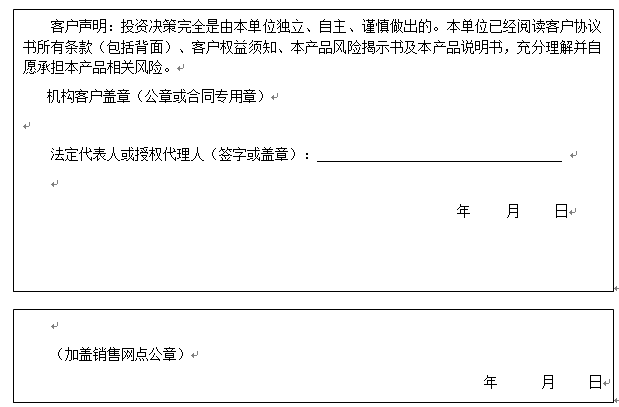 客户签名:                                    客户声明:投资决策完全是由客户独立、自主、谨慎做出的。客户已经阅读客户协议书所有条款(包括背面)、客户权益须知、本产品风险揭示书及本产品说明书,充分理解并自愿承担本产品相关风险。)