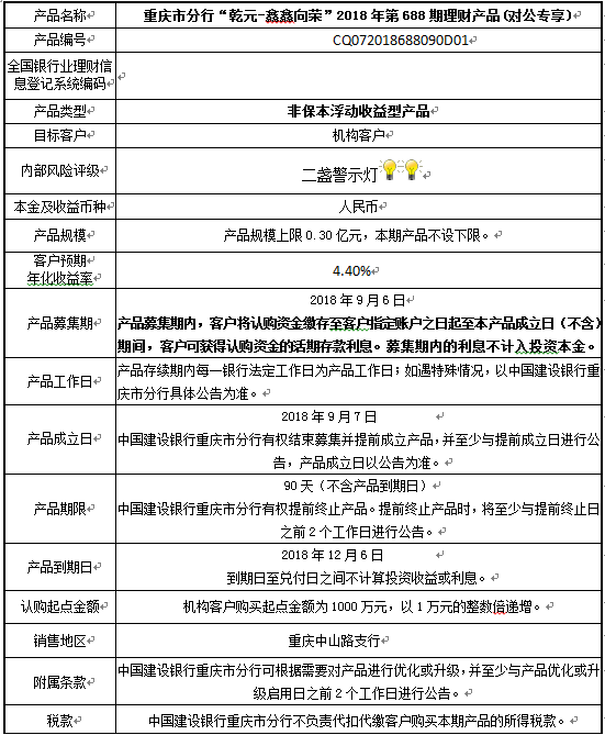 3.中国建设银行重庆市分行可根据市场情况等调整产品规模上、下限,并最迟于调整规模上下限当日进行公告。